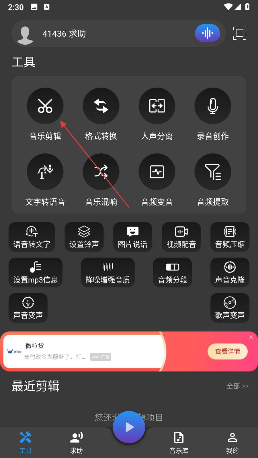 1、在首页页面,点击【音乐剪辑】,进入音乐剪辑创作界面。