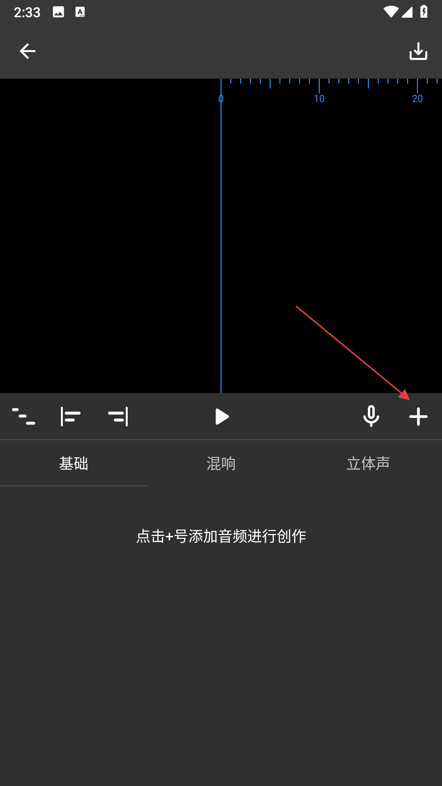 2、在音乐剪辑创作界面,点击【+】号,弹出添加音频的选项菜单。