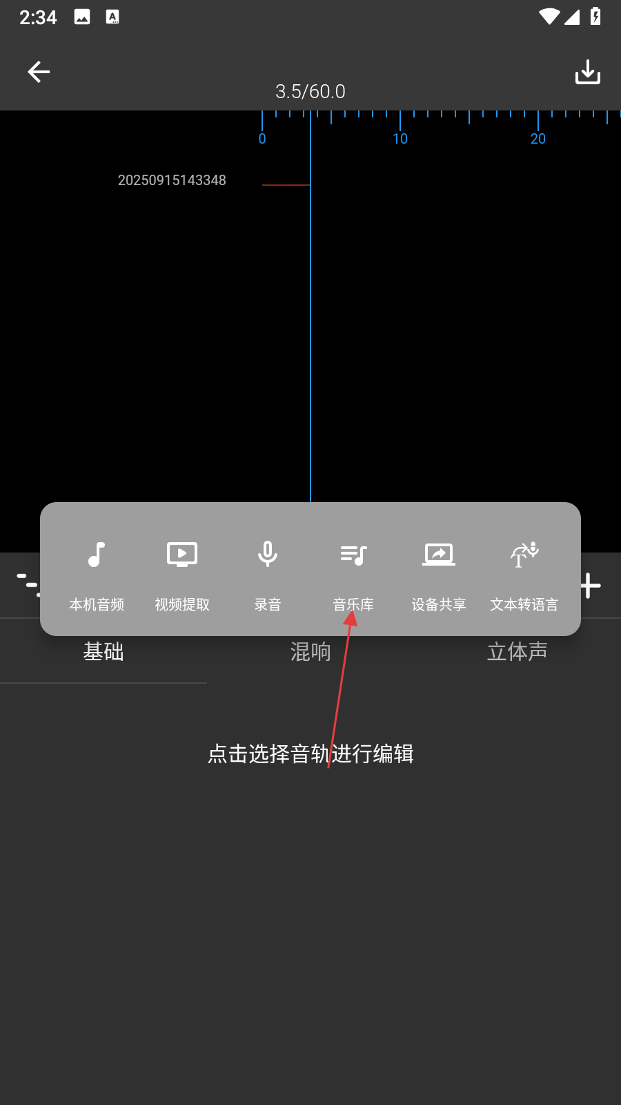 3、在添加音频的选项菜单里,点击【音乐库】,选择要剪辑的音频素材。