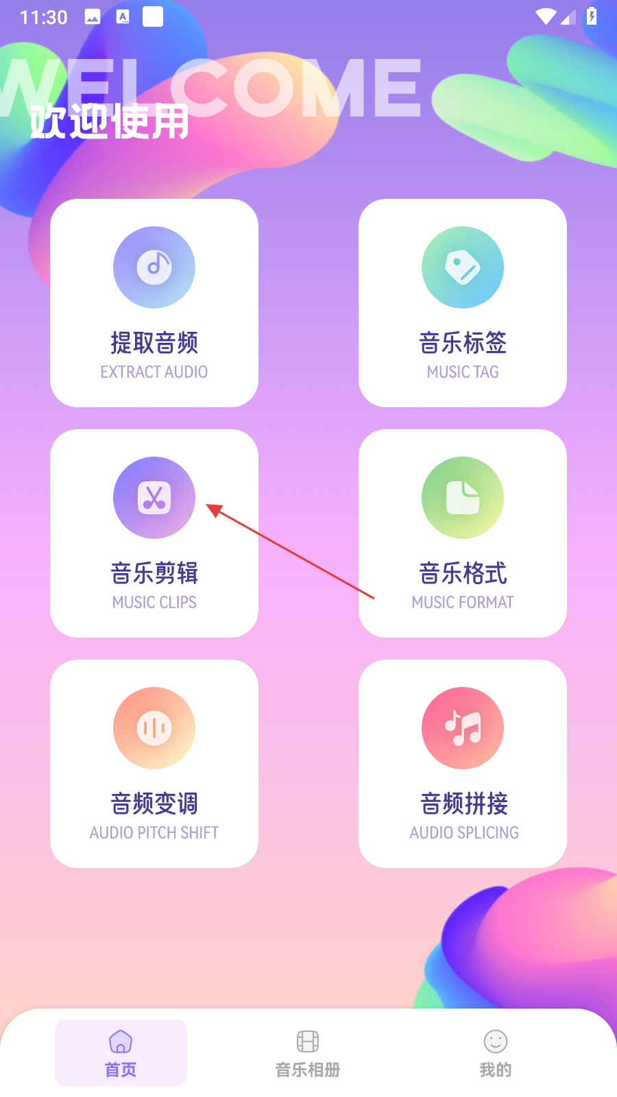 1、在首页,点击【音乐剪辑】,进入选择音频页面。