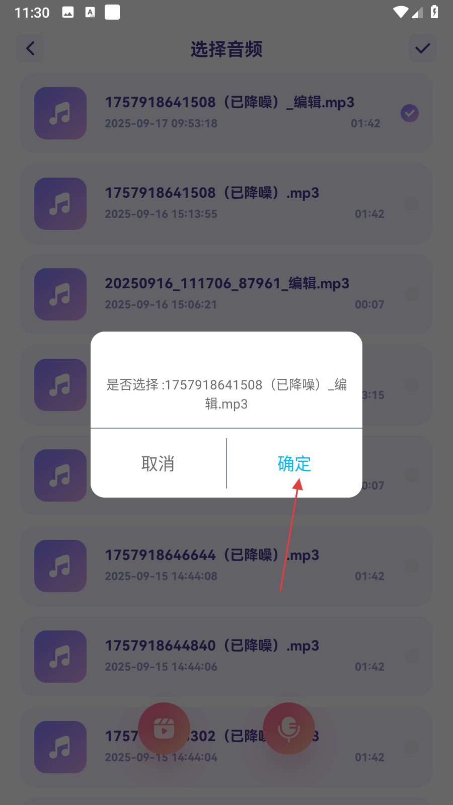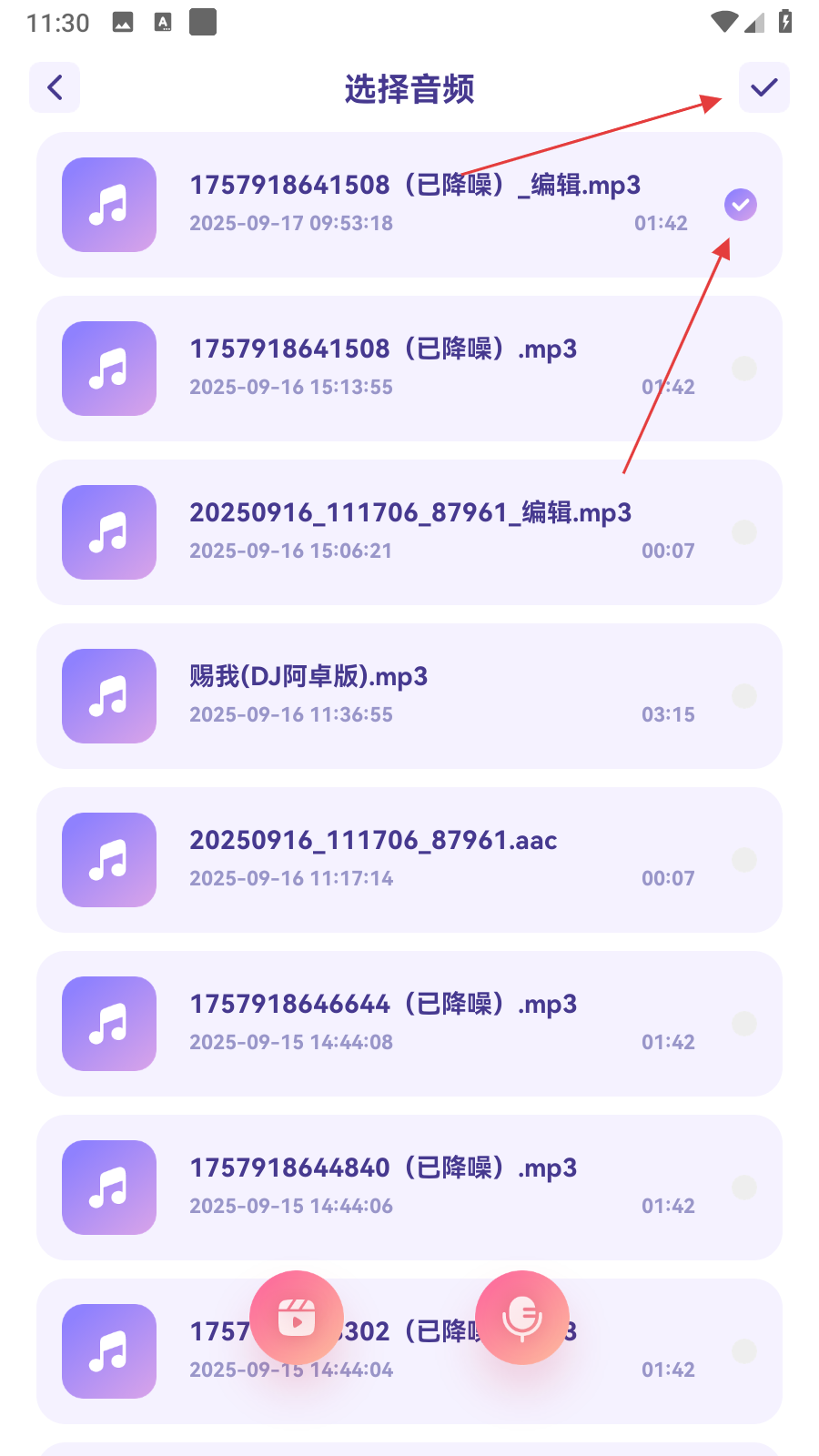 2、在选择音频页,勾选【要剪辑的音频】后,点击右上角【对勾图标】。