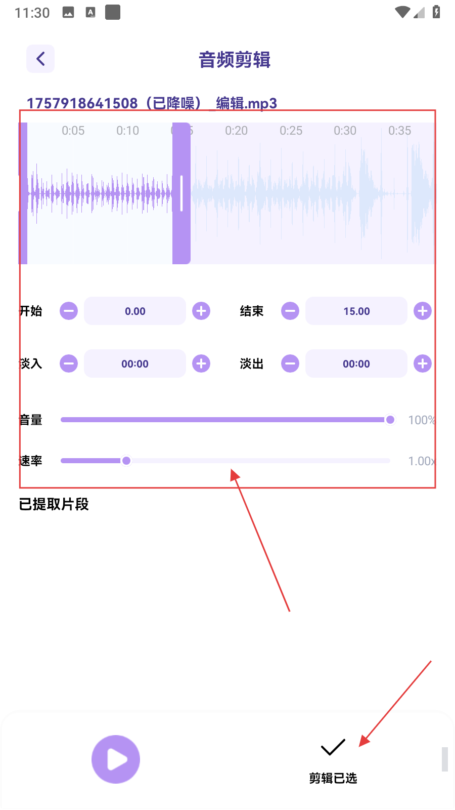 4、在音频剪辑页,设置好【剪辑参数】后,点击【剪辑已选】,即可完成音频剪辑操作。