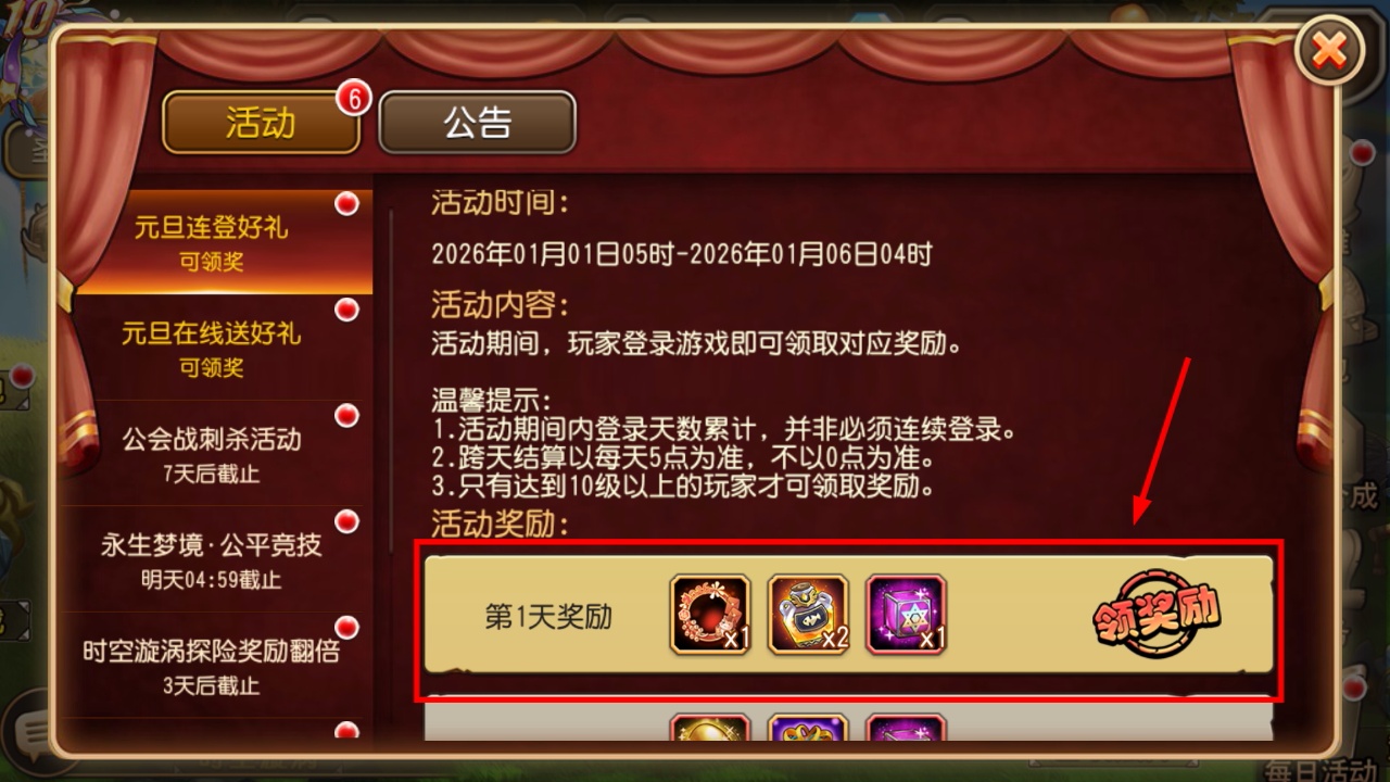 1、【元旦连登好礼】活动期间登录可领对应奖励,第一天奖励含三种道具,记得点击领取奖励按钮获取。