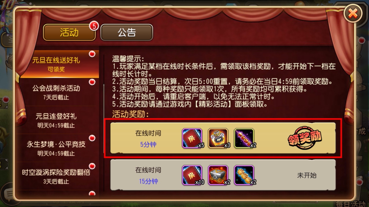2、【元旦在线送好礼】满足在线时长后领该档奖励才能计时下一档,当日4:59前领取避免重置。