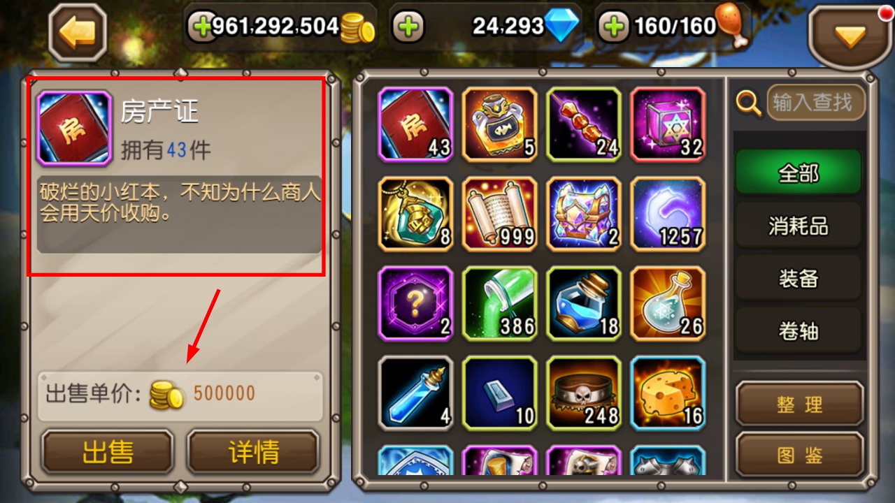 3、【房产证】是商人高价收购的道具,拥有43件,出售单价500000金币,可出售换大量金币。