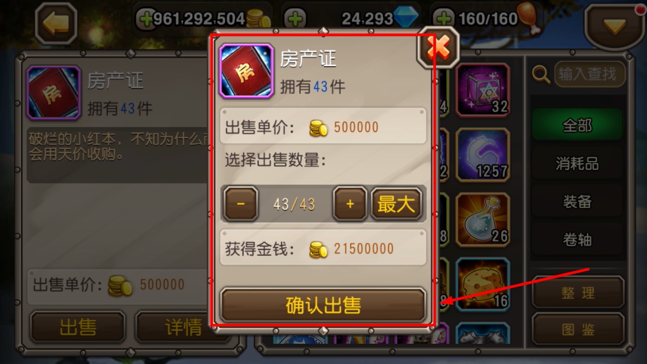 4、出售【房产证】时选择数量,确认后获得对应金币,全部出售43件可得到21500000金币。