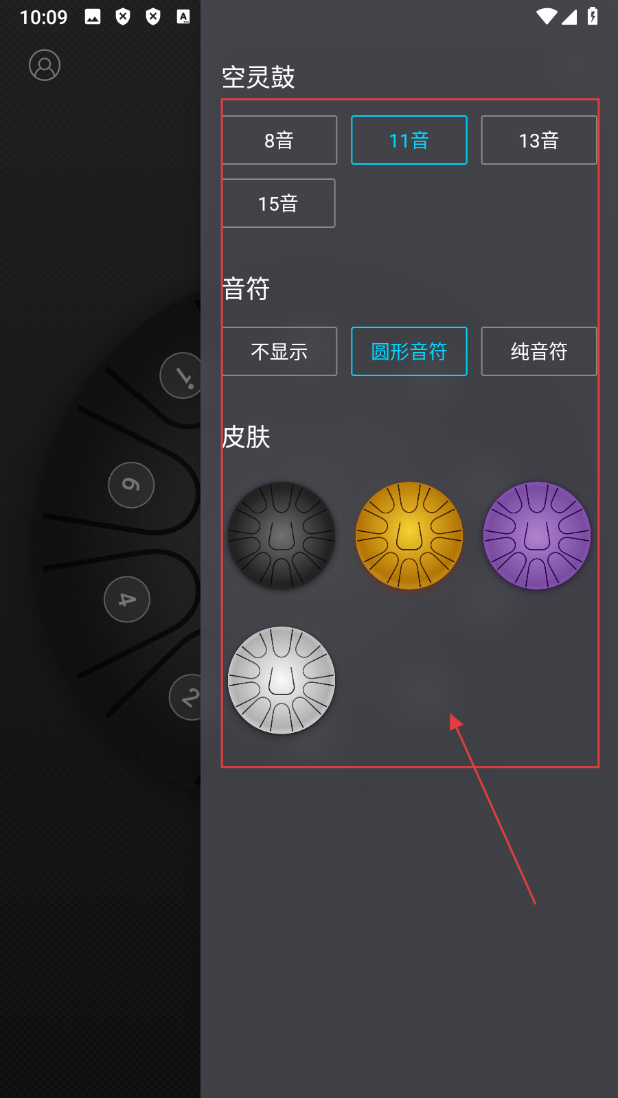 2、在设置栏页面,可选择【空灵鼓音数、音符显示样式及皮肤】。