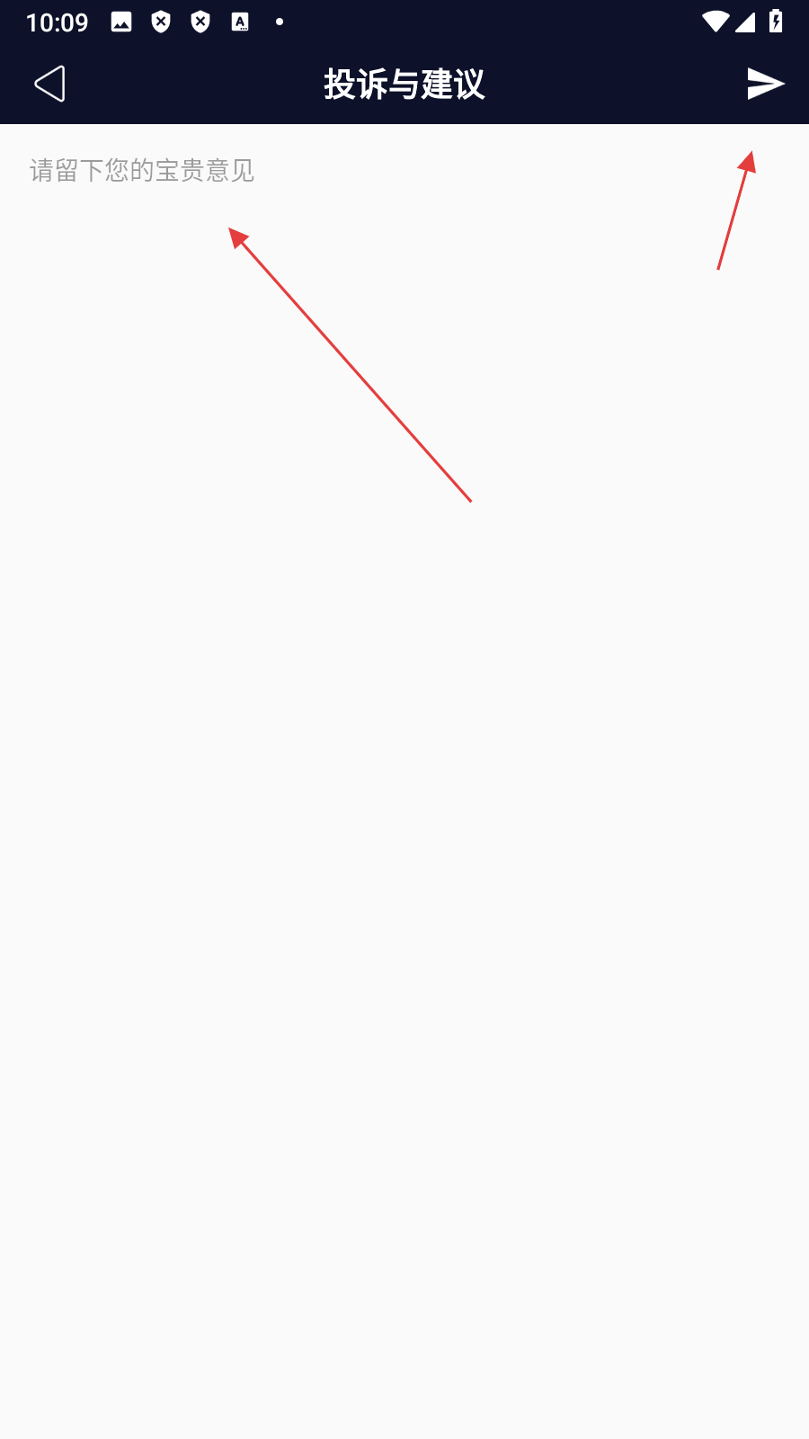 4、进入投诉与建议页面,可留下【宝贵意见反馈】点击发送。