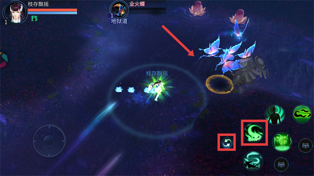 3、战斗时通过左下角虚拟摇杆控制角色移动,灵活走位躲避【业火蝶】攻击,同时找准时机发起反击。