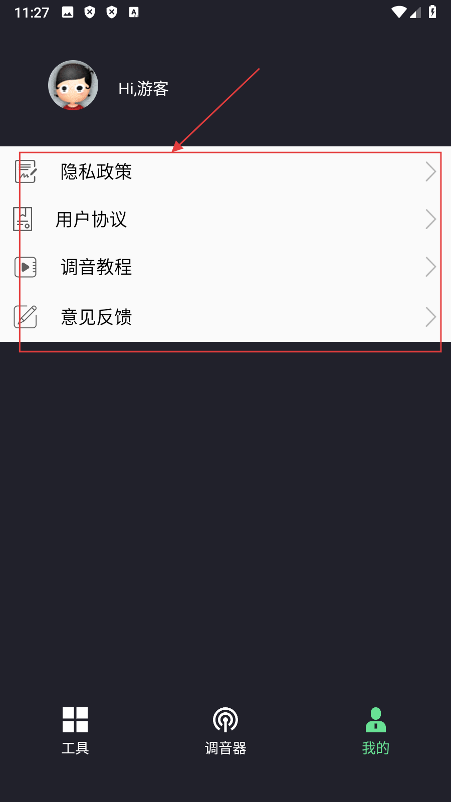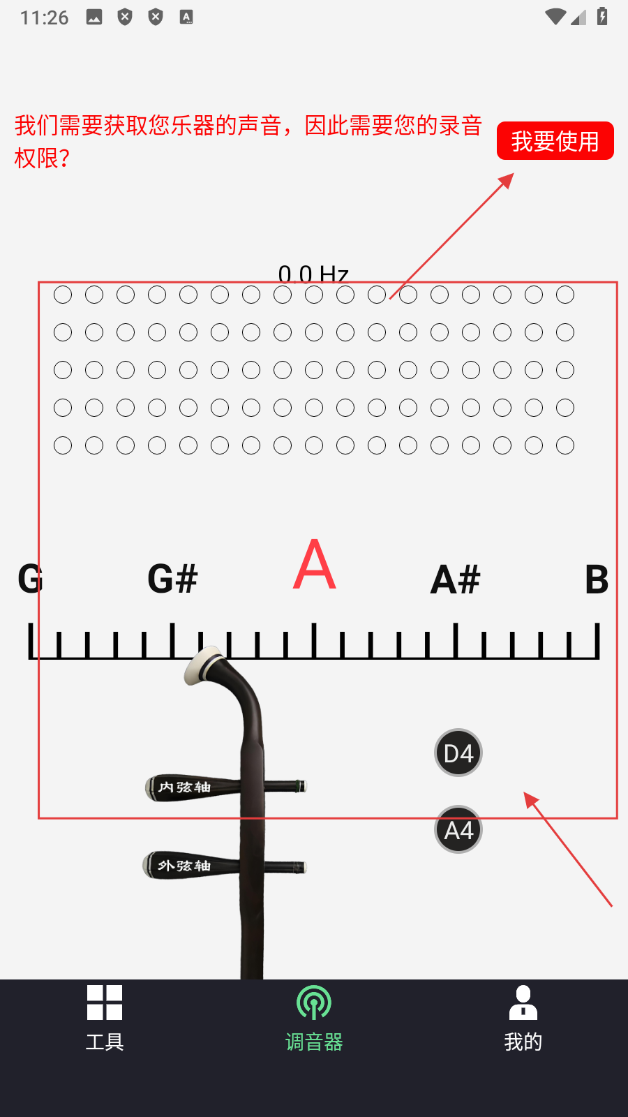1、进入调音器界面,点击【我要使用】,授予录音权限,即可【借助界面元素进行乐器调音】。