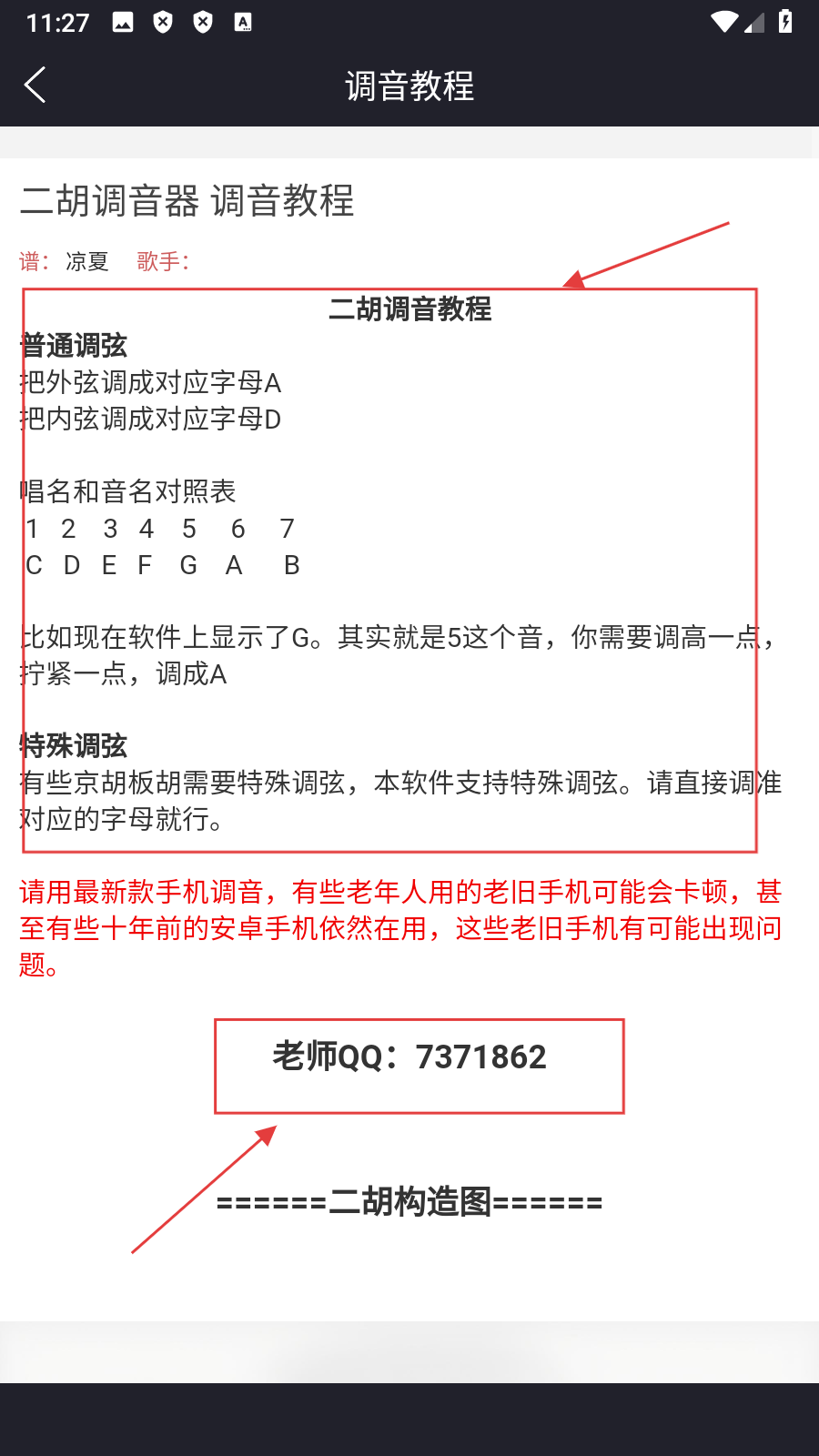 4、进入调音教程页面,能学习【二胡普通调弦、特殊调弦】等方法,遇到问题【还可联系教程里的老师QQ】。