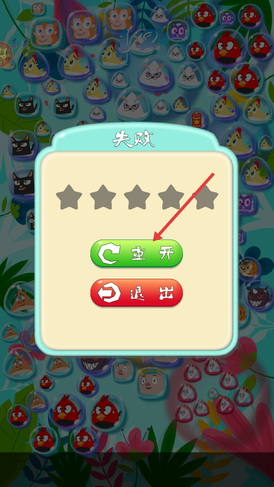 4、游戏失败后,点击红色箭头指向的【重开】按钮,重新开始游戏。
