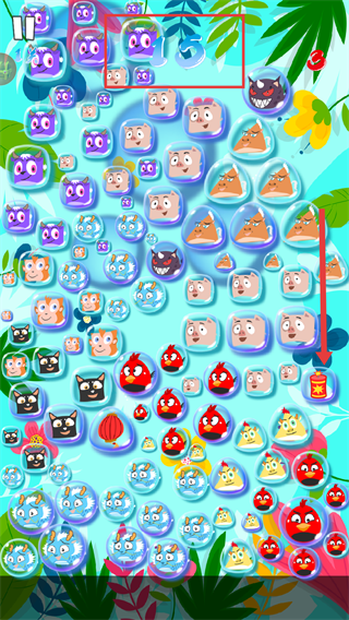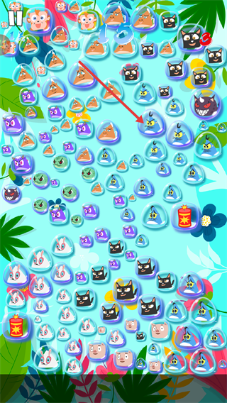 2、瞄准红色箭头指向的相同生肖图案,消除气泡。