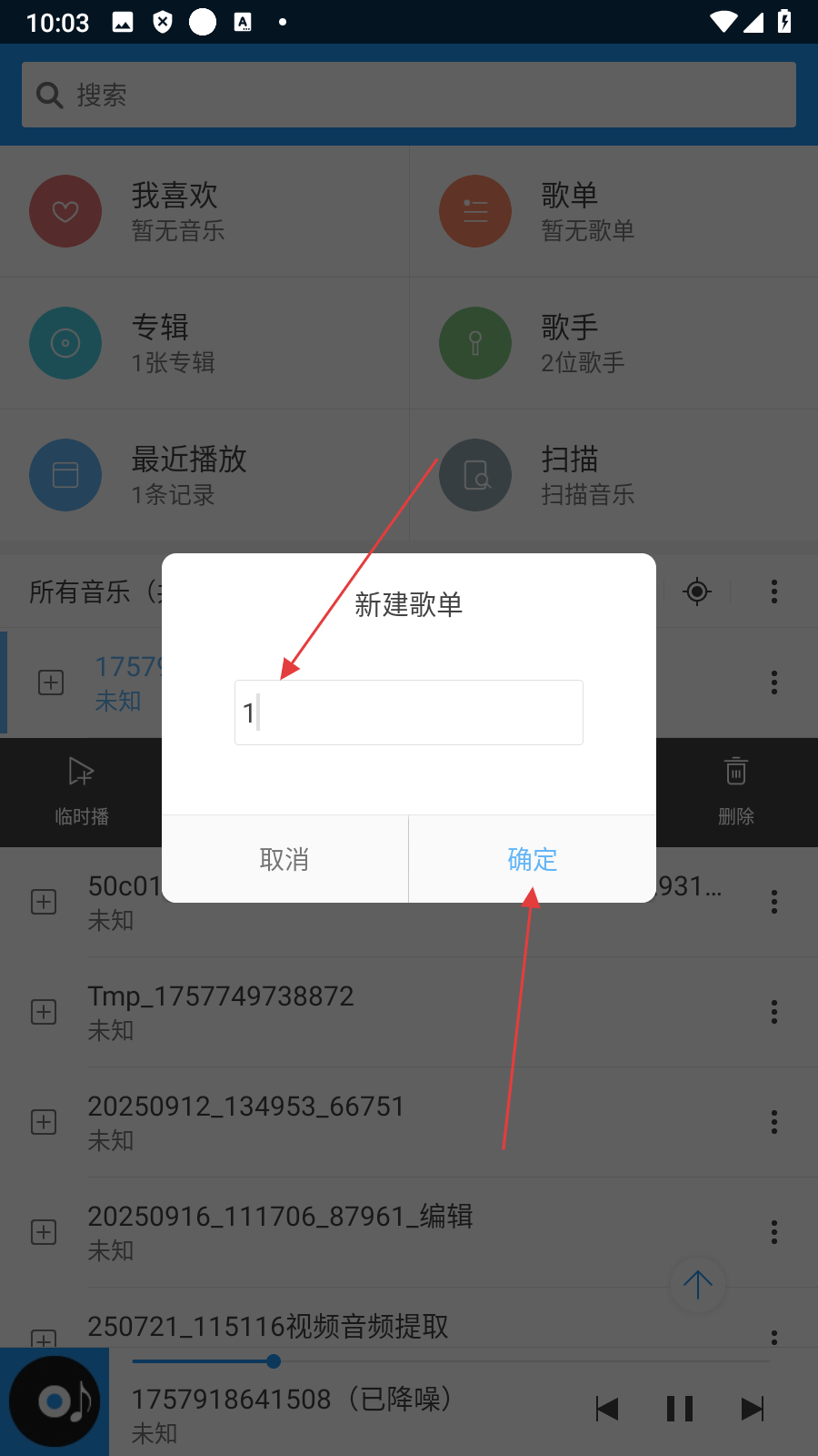4、在新建歌单窗口的输入框中【输入歌单名称】,然后点击【确定】即可添加音乐至歌单。