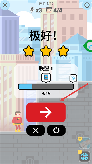 4、关卡完成获【3】星评价,点击红色箭头按钮进入下一关。