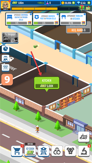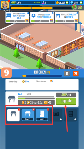 4、购买餐桌后点击【Upgrade】按钮升级,同时解锁新的厨房设施(如冰箱等),进一步优化厨房功能和收益。