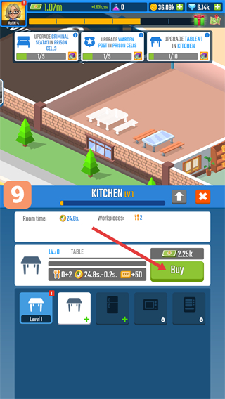 3、在厨房界面点击【Buy】按钮购买餐桌,提升厨房的工作空间和收益能力。