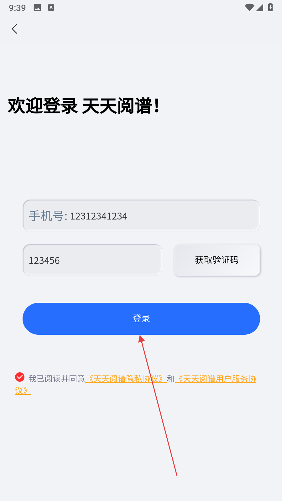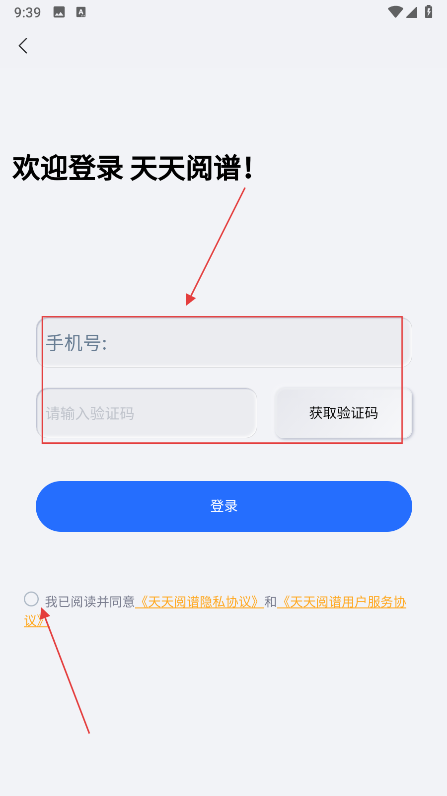 3、在登录页面,勾选【同意协议】,并【输入手机号和验证码】。