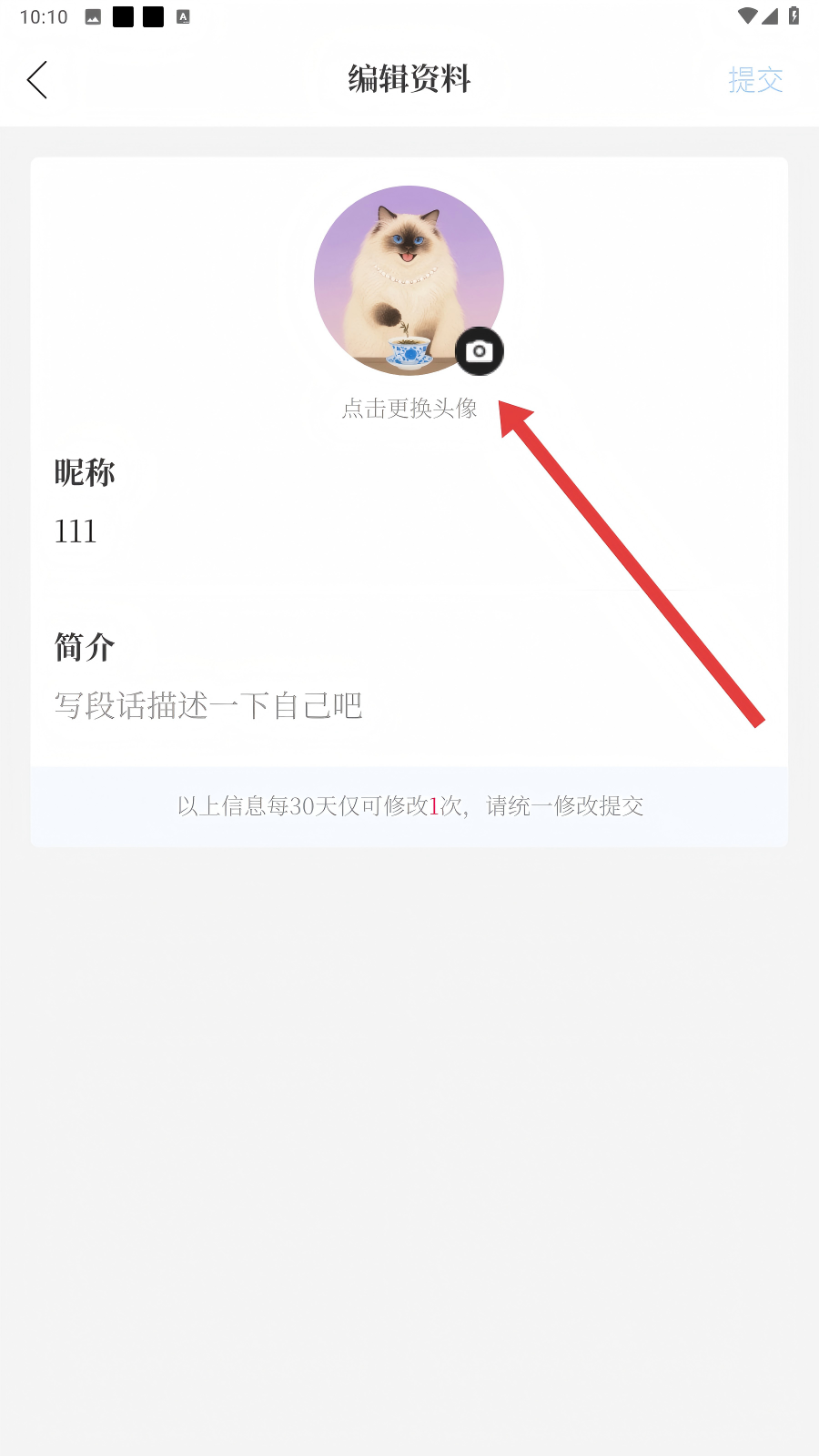 2、在编辑资料页面,看到头像区域后,点击【点击更换头像】的标识,准备更换头像哟。