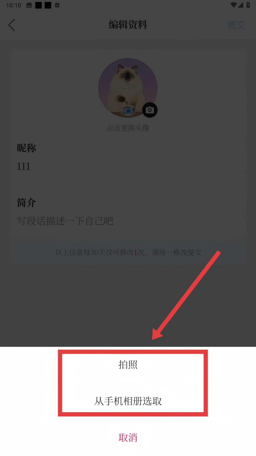 3、点击后会弹出选项,我们可以选择【拍照】或者【从手机相册选取】,挑选心仪的头像图片。