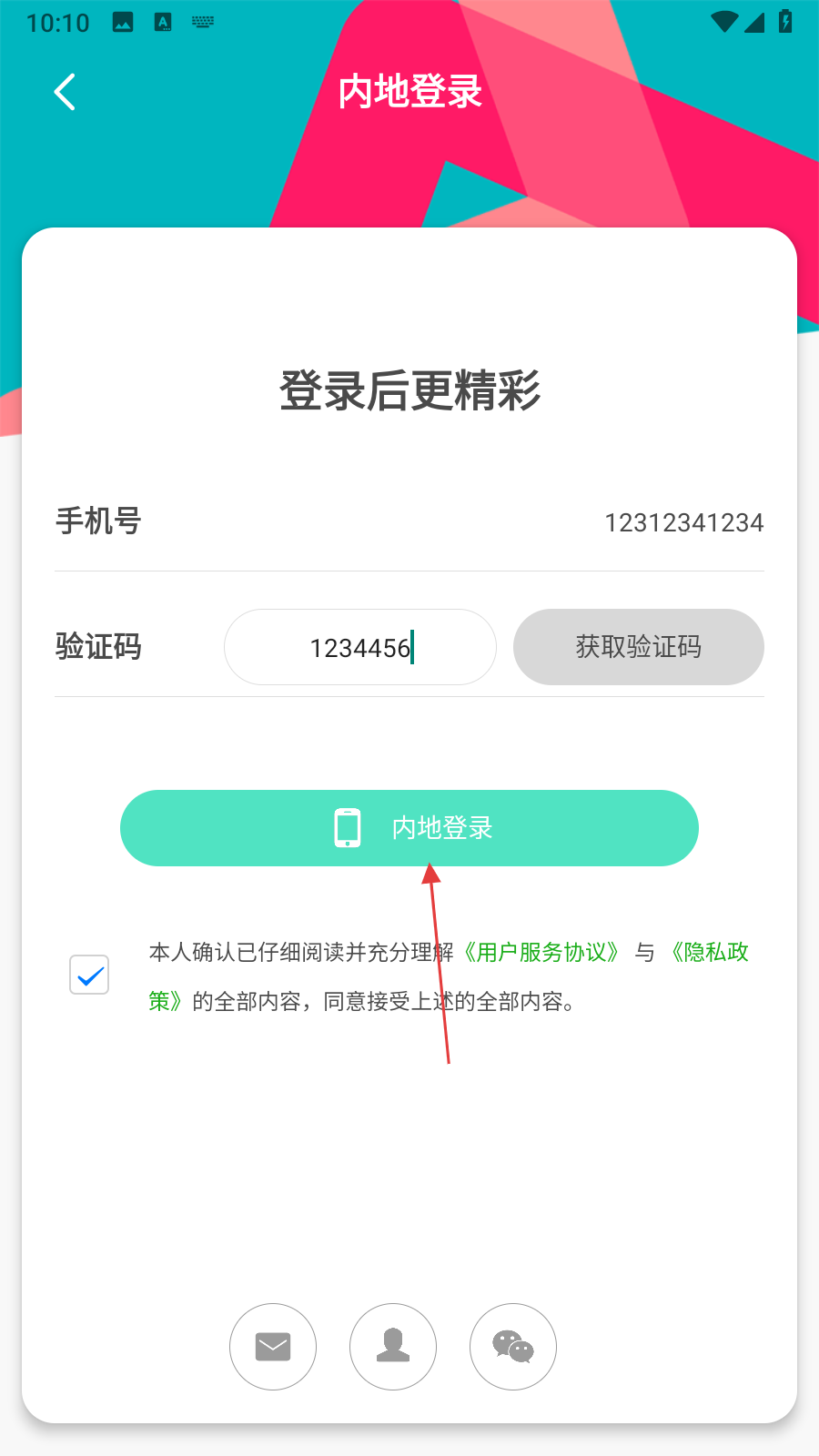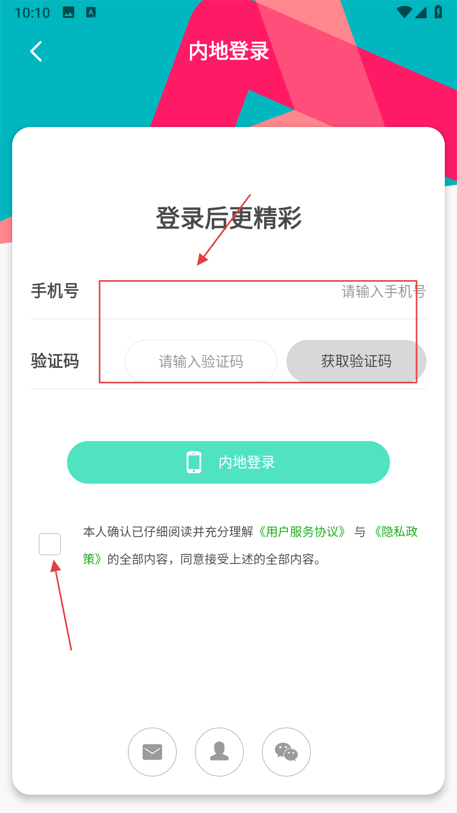 3、在内地登录页面,勾选【同意相关协议】,输入【手机号和验证码】。