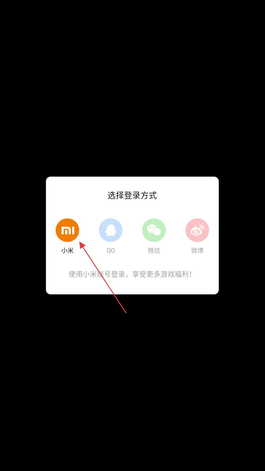 1、在选择登录方式界面,点击【小米】选项,进入使用小米账号登录页面。