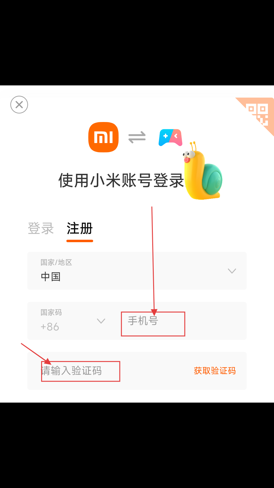 3、在小米账号注册页面,输入【要注册的手机号码】,然后获取并【输入验证码】。