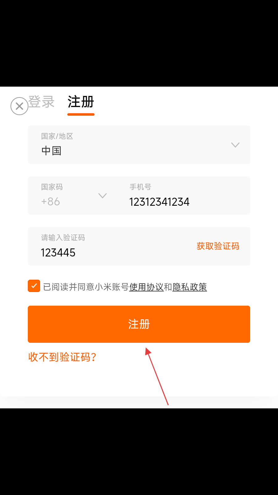 4、验证码输入完成后,勾选同意相关协议,点击【注册】按钮,即可完成小米账号注册。