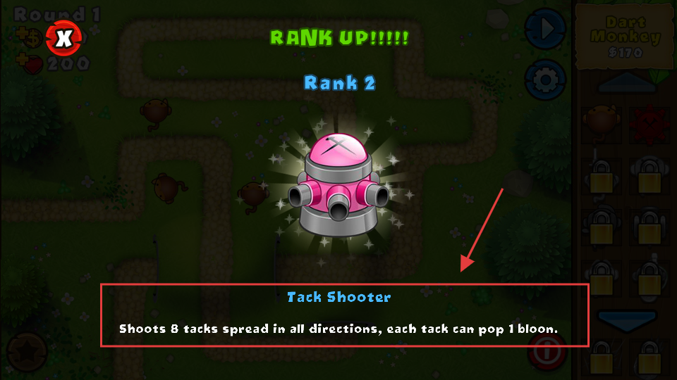 1、选择【TackShooter】进行放置,它能朝所有方向发射【8】枚钉刺,每枚钉刺可击破1个气球,提升等级后效果会更明显。