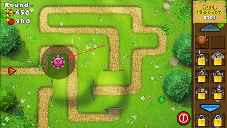 2、【TackShooter】售价为【305】,放置在地图路径的关键交汇点,可覆盖更多路径,有效拦截来犯的气球群。