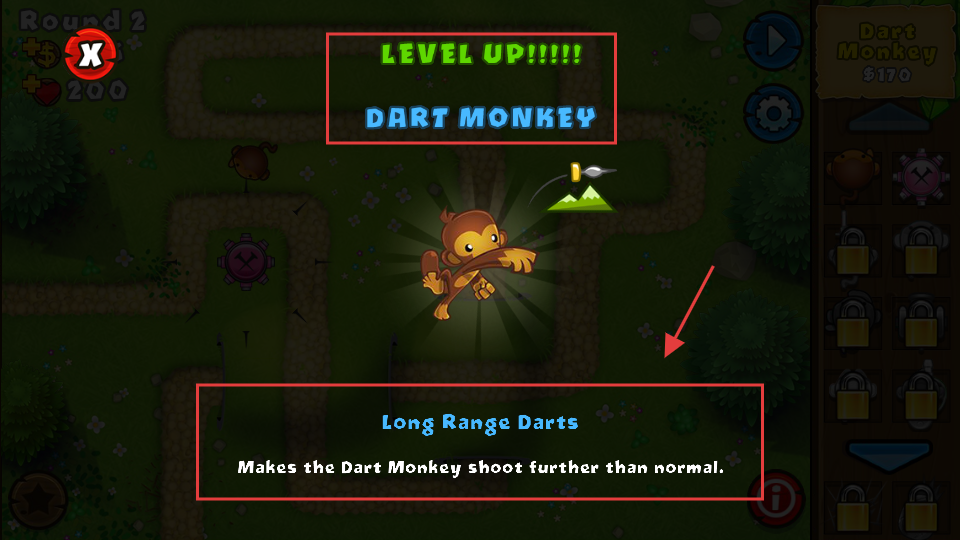 3、【DartMonkey】升级后解锁【LongRangeDarts】技能,该技能可延长射击距离,帮助打击更远位置的气球目标。