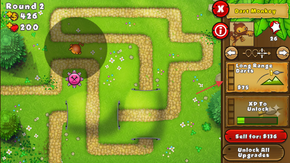 4、【DartMonkey】的【LongRangeDarts】升级需花费【75】,积累足够XP解锁后,使用该升级能大幅提升气球击破效率。