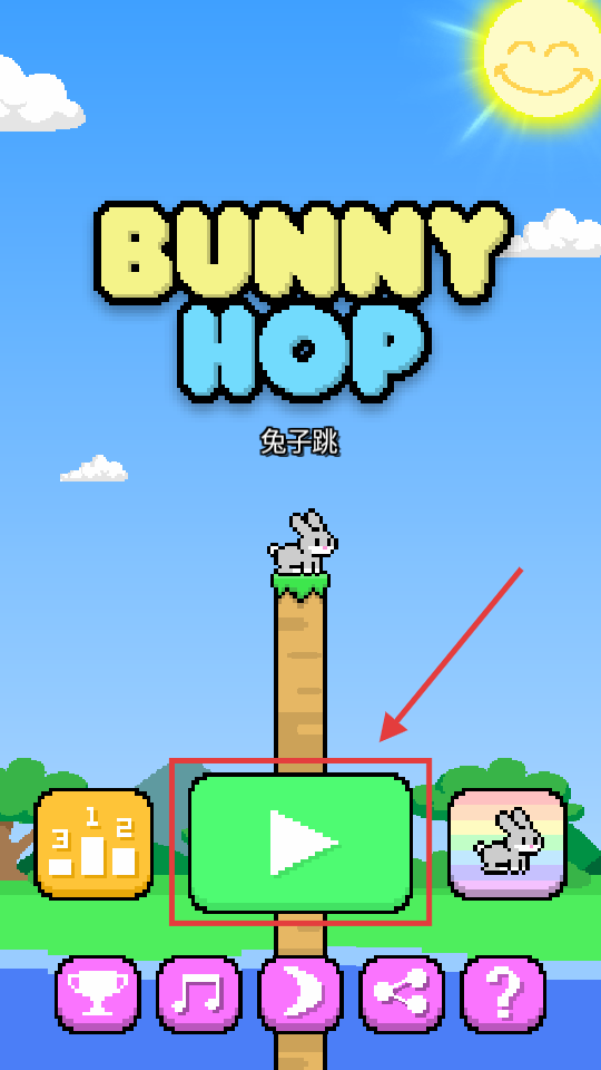 1、进入【BUNNYHOP-兔子警察】游戏界面后,点击中间的【绿色播放按钮】即可开始挑战跳跃关卡。