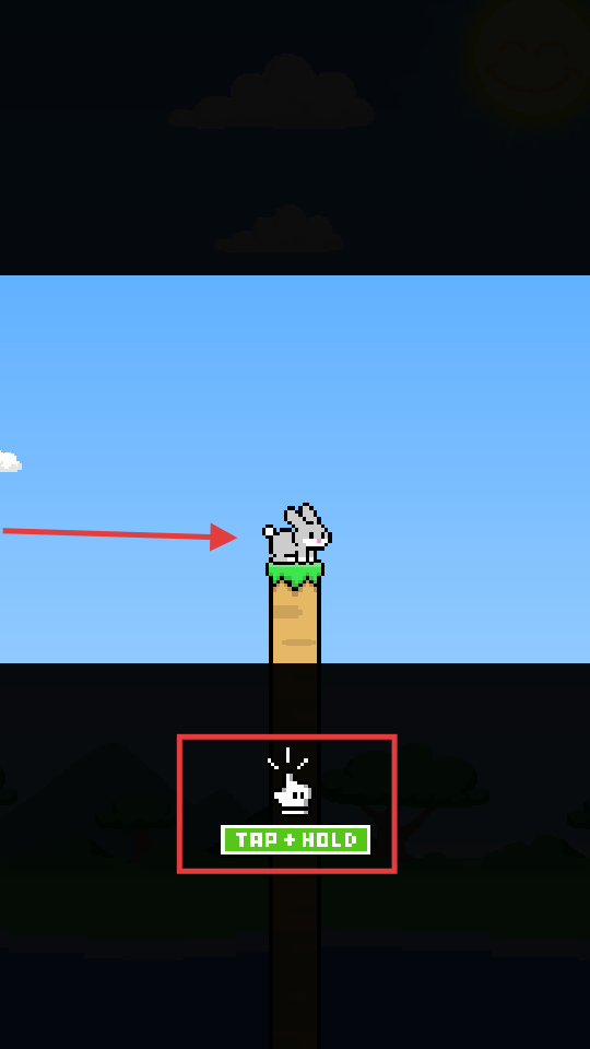 2、在游戏中,通过【长按屏幕】的操作方式控制兔子跳跃的力度,为后续跳上柱子做准备。