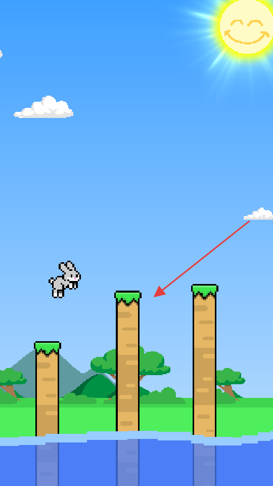 3、跳跃时需瞄准前方的【柱子】,把握好时机让兔子准确落在柱子顶部,避免掉落水中。