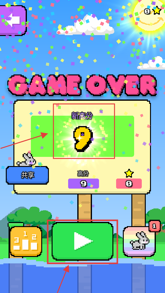 4、游戏结束后,可查看【新高分-9】,点击【绿色重玩按钮】重新开始,争取突破更高分数。