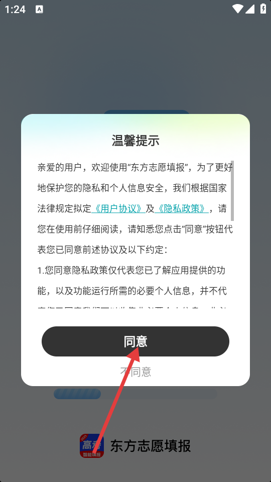 1、打开APP,在“温馨提示”弹窗中点击【同意】。