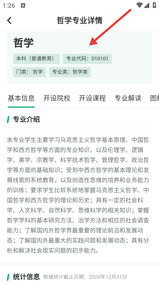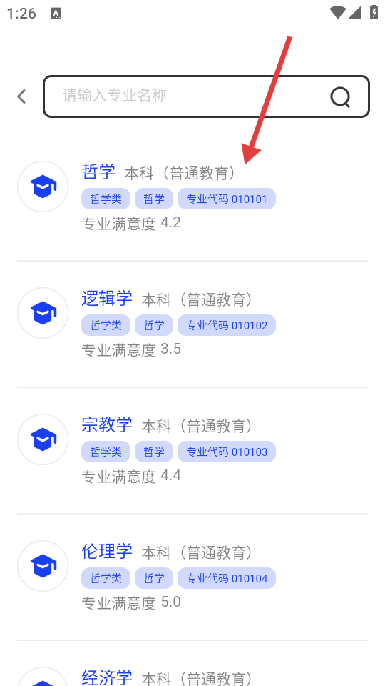 3、进入专业查询页面,选择要查看的专业,如“哲学”。