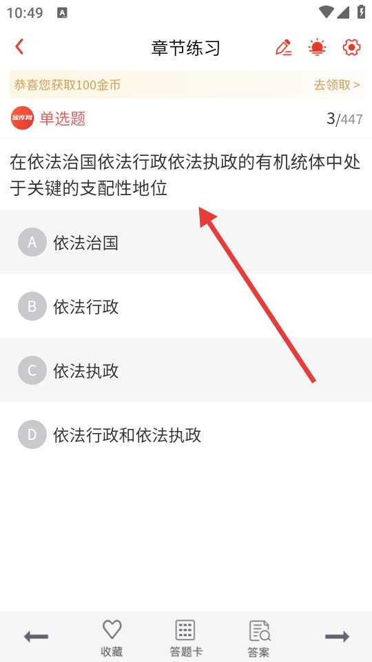 3、进入章节练习后,会呈现单选题等题型,可进行答题,也能使用收藏、答题卡等功能。