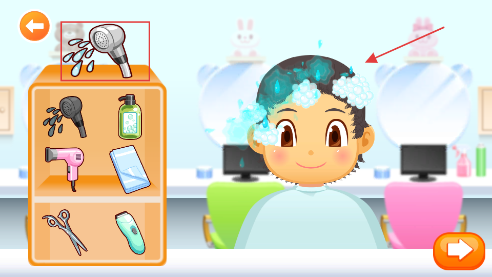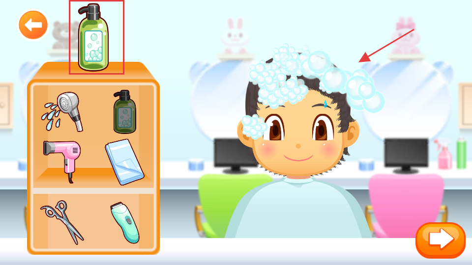 2、在理发服务中,选择柜子里的【洗发水】可为顾客头发打上丰富的【泡沫】提升体验。