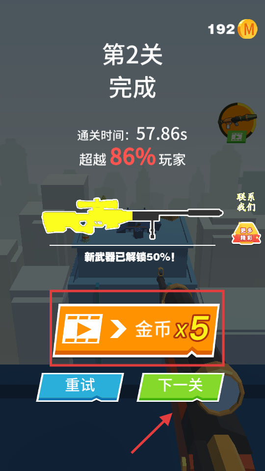 4、通关后点击【下一关】挑战,或看广告得【金币x5】,金币用于解锁武器、皮肤,强化战力。