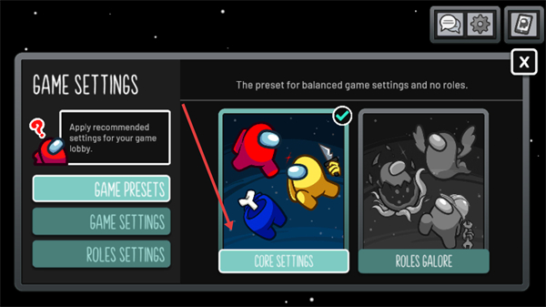 2、进入【GAME-SETTINGS】界面,选择【CORE-SETTINGS】预设,该预设为平衡设置无角色技能,适合新手快速上手对局。
