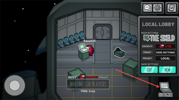 3、在【LOCAL-LOBBY】房间中,点击右侧【CUSTOMIZE】按钮,可再次调整角色装扮,同时等待其他玩家加入房间。