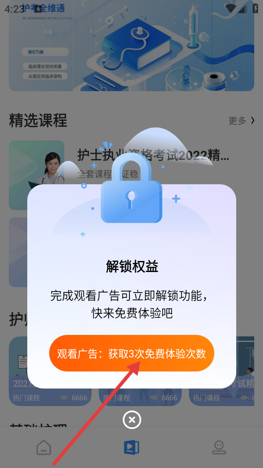 3、若课程需解锁权益,点击【观看广告:获取3次免费体验次数】,观看广告后解锁。