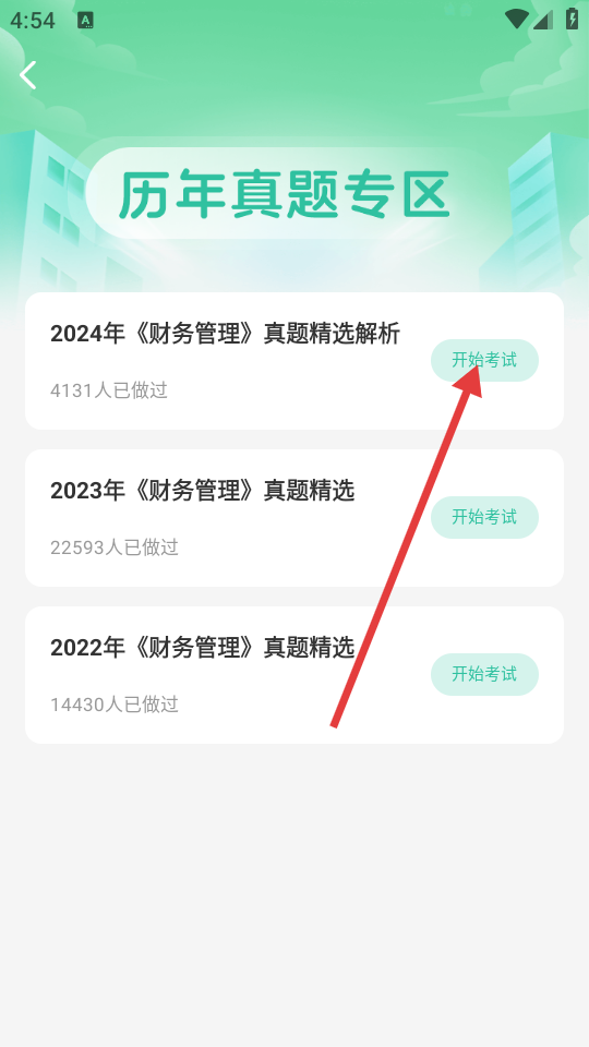 2、在历年真题专区页面,选择想要练习的真题卷,点击【开始考试】。