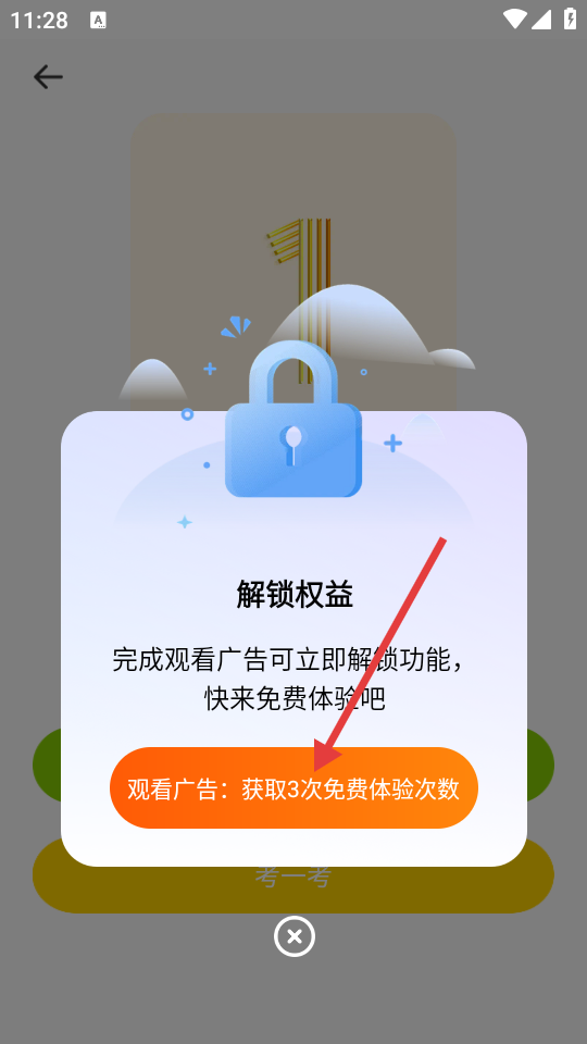 3、若弹出“解锁权益”窗口,点击【观看广告:获取3次免费体验次数】,观看广告解锁功能。