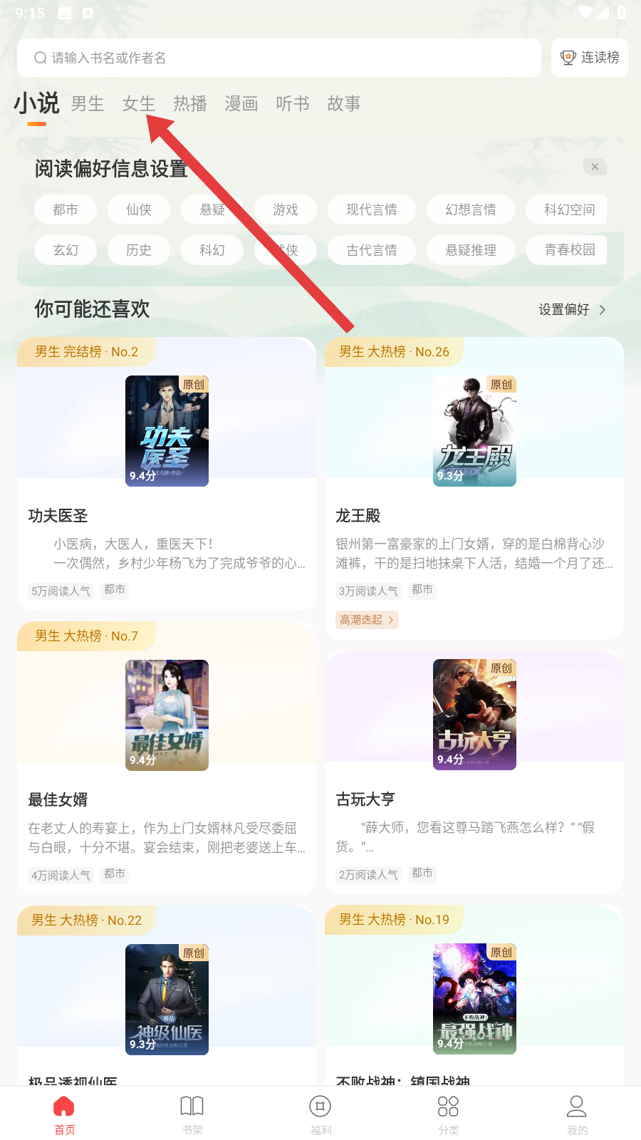 1、打开连尚读书,在顶部导航栏找到【女生】标签,点击切换,方便找到心仪的言情类书籍哦。