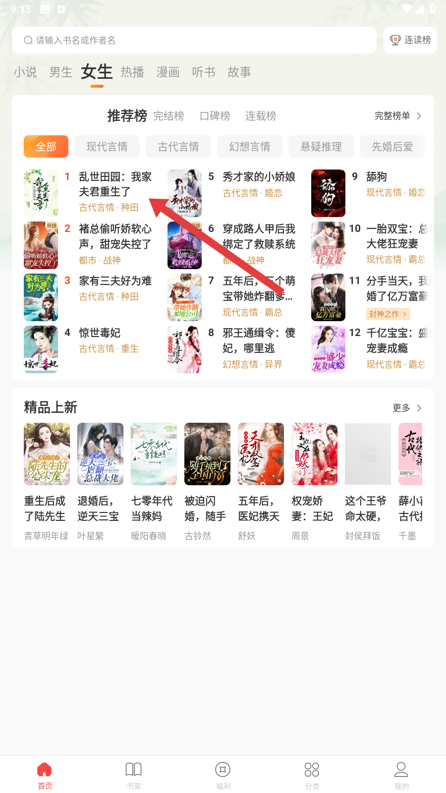 2、在女生专区的推荐榜里,挑选一本喜欢的小说,比如【乱世田园-我家夫君重生了】,点击进入书籍详情页。