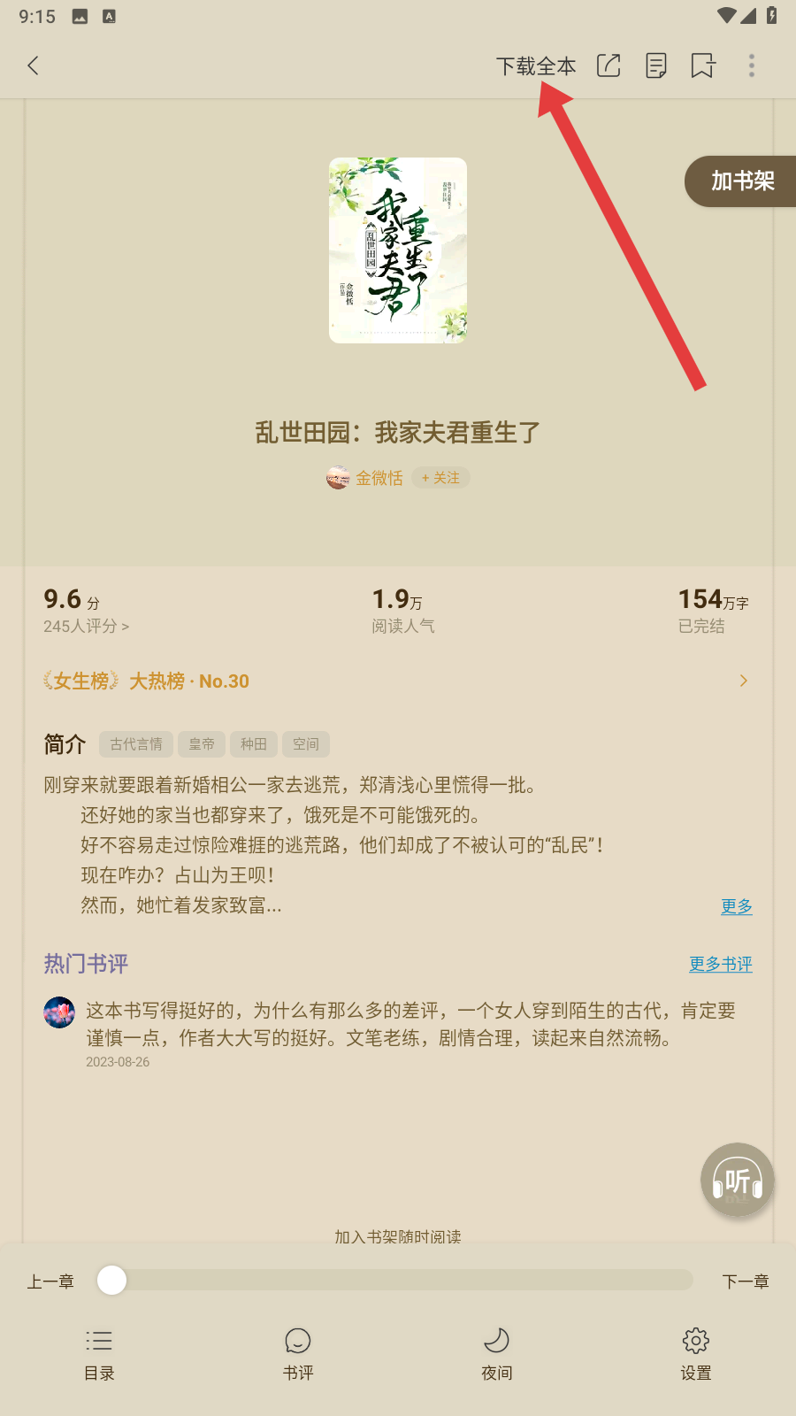3、进入书籍详情页后,找到右上角的【下载全本】按钮,点击它,就能触发下载选项啦。