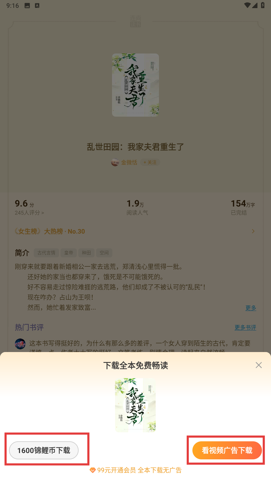 4、点击【下载全本】后,会弹出下载方式,可选择【1600锦鲤币下载】或【看视频广告下载】,就能把书籍下载到手机啦。